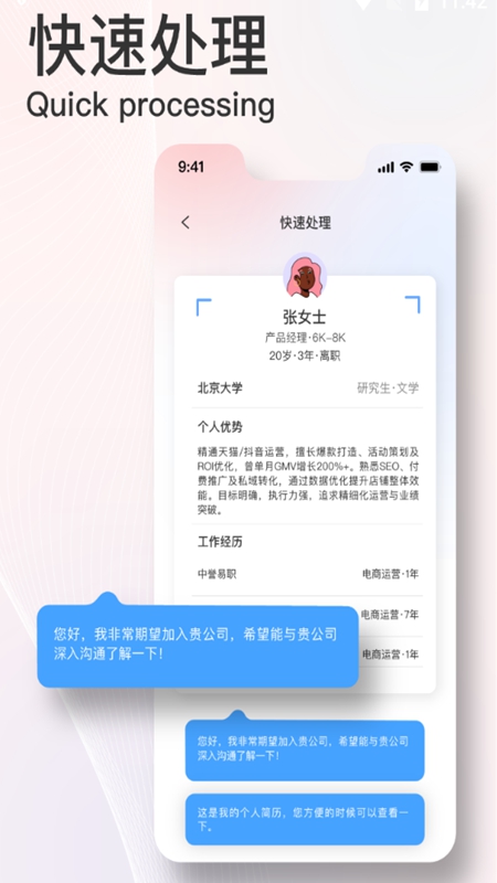 2.无限畅聊沟通:不限时、不限次、不收费的即时通讯功能,支持文字、语音、视频等多种交流方式,打破传统招聘中的信息壁垒,让求职者与HR直接对话,提升沟通效率。