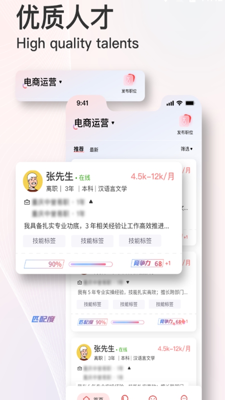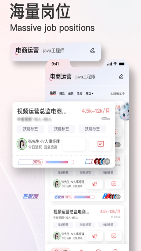 2.精准智能匹配:依托多维度动态标签体系与机器学习算法,深度融合企业岗位画像和求职者能力图谱,实现供需双方的毫秒级精准对接,职位匹配度超95%,减少无效投递。