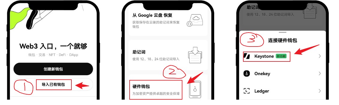 1、打开 OKX App,点击顶部的【Web3 钱包】,选择【导入已有钱包】-【硬件钱包】,选择【Keystone】。