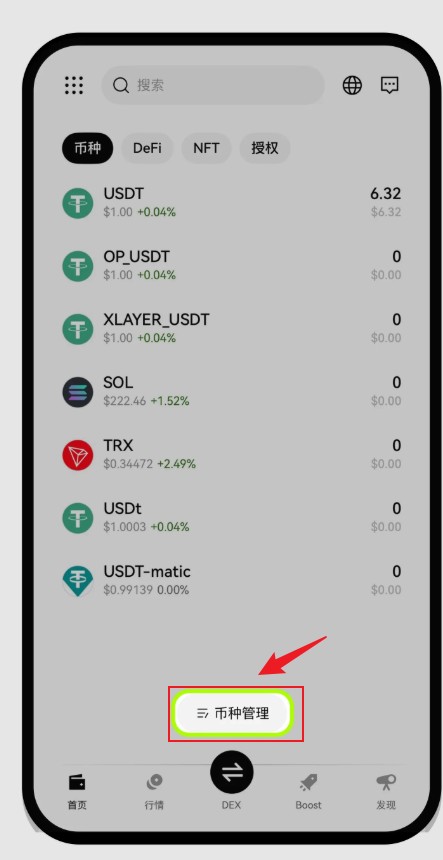 钱包的币种列表不会默认显示所有币种,您可能需要通过【币种管理】功能手动添加想要查看的币种到钱包代币列表中。