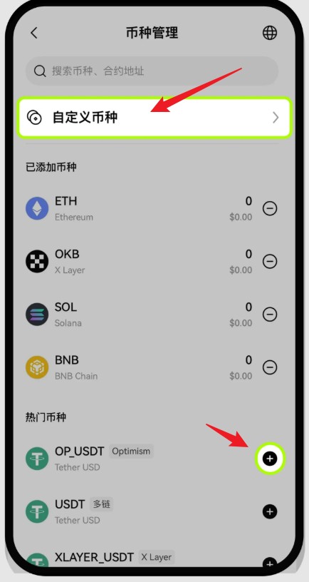 如果搜索不到该币种,您可以点击【自定义币种】按钮,手动选择网络和协议,输入币种名称后完成添加。
