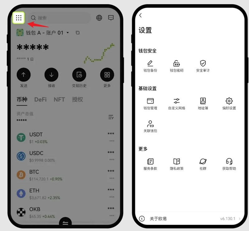 1、在钱包 App 点击左上角的 【九宫格】 图标 - 即可找到钱包设置选项。
