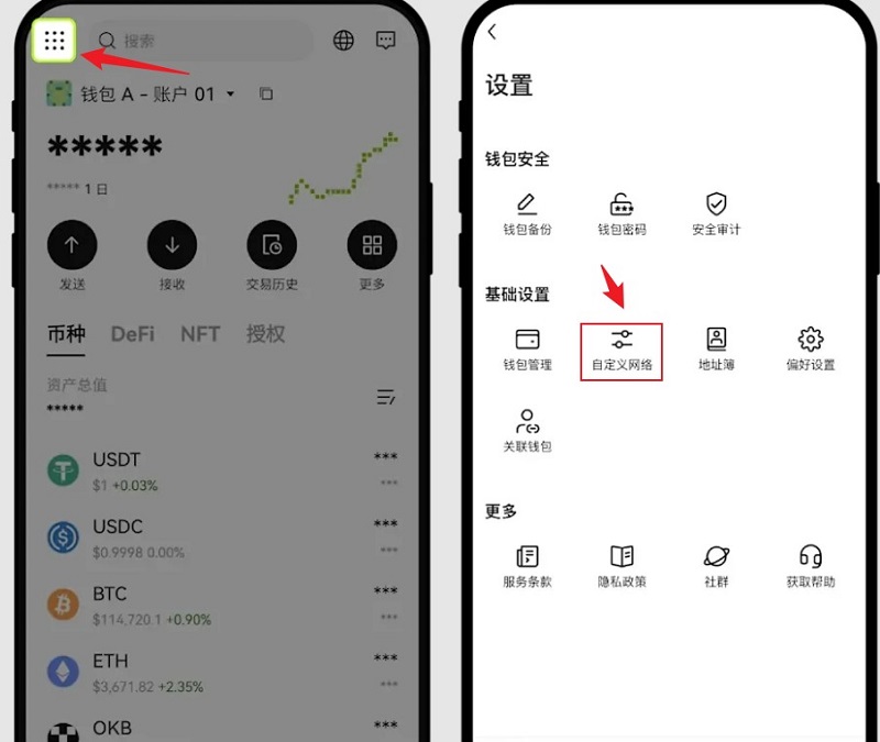 在钱包 App 点击左上角的 【九宫格】 图标 - 点击 【自定义网络】 - 【添加网络】