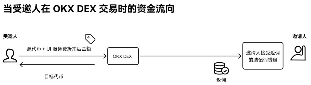 当您邀请的用户在 OKX DEX 上进行交易时,您将从他们的 UI 服务费中获取返佣,佣金将直接发放至您的钱包。