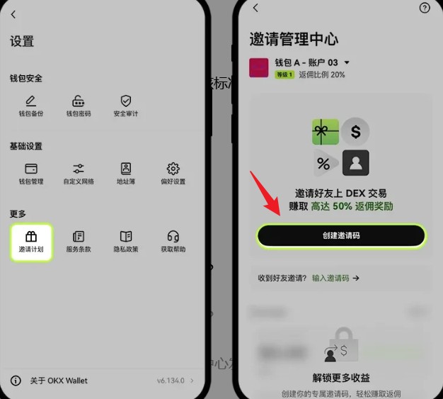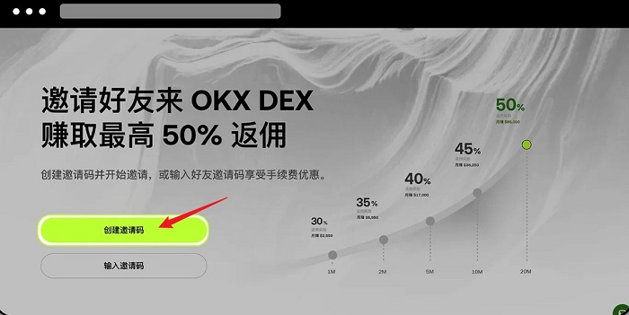 2.首次生成邀请码:通过 DEX 邀请返佣看板点击【创建邀请码】,即可生成自定义邀请码。