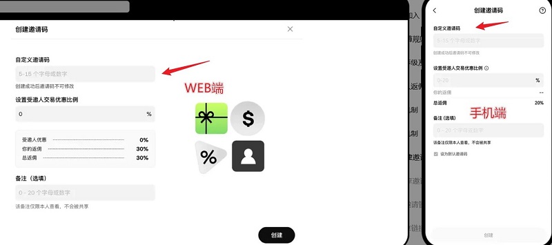 3.您可创建5–15位字母或数字的邀请码,每个助记词钱包最多可生成100个邀请码。创建后不可修改或删除。