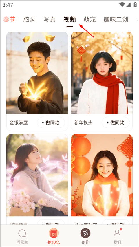 1、打开元宝app,进入后点击下方创作版块,再点击上方“视频”;