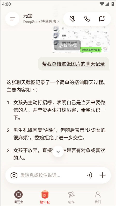 2、从相册中找到要总结的聊天记录截图,然后输入“帮我总结这张图片的聊天记录”即可。