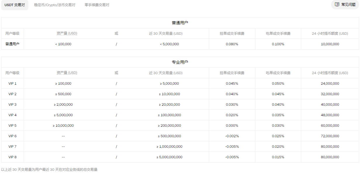 根据过去 30 天的资产量或交易量的不同,用户区分为普通用户和 VIP 会员用户。用户的等级决定了其下一个交易日的交易手续费。