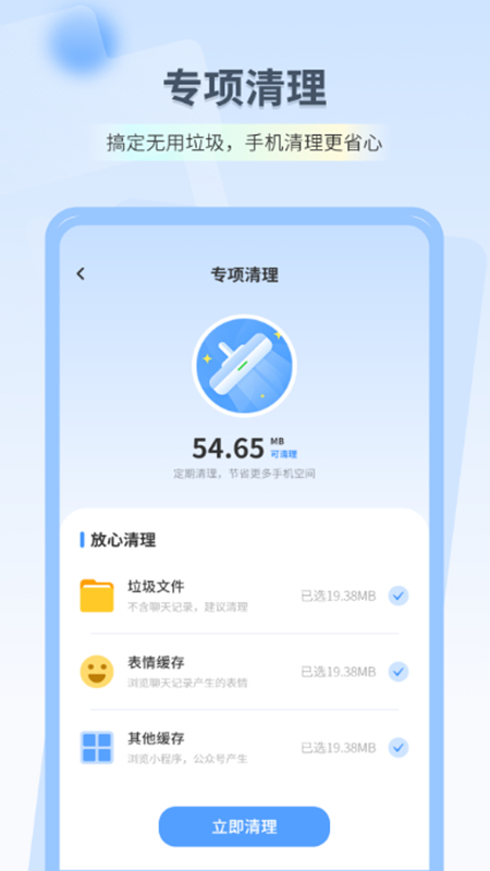 4、应用专项清理:针对微信、QQ、抖音等高频使用应用,提供专属清理模块,可单独清理聊天记录、图片、视频、文件等分类数据。例如,微信清理时可选择保留重要群聊文件,避免误删。