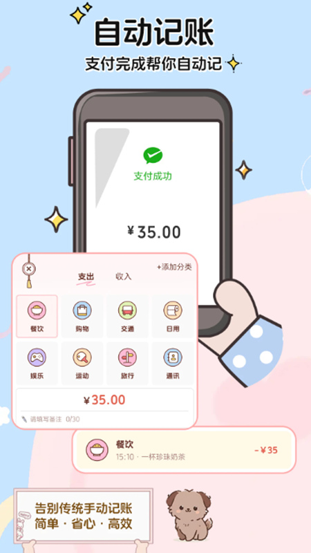 2、多维度智能分类系统:预设餐饮、购物、交通等20+高频场景分类,同时支持用户自定义标签。系统能根据消费关键词自动匹配分类,如输入“打车20元”自动归类为“交通-出行”,确保每笔账目精准归类,消费分布一目了然。