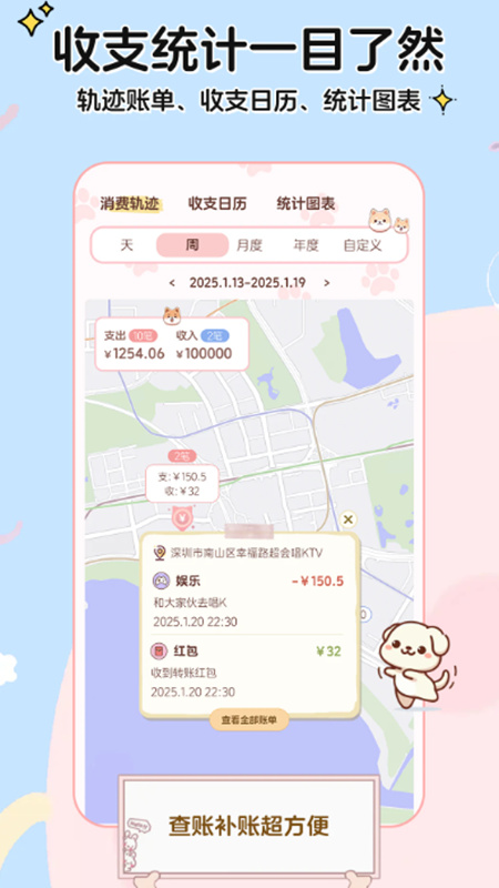 2、地图轨迹消费记录:根据支付地理位置自动标记消费点,在地图上生成消费轨迹。用户可查看“本周在商场消费3次”“上月常去便利店A”等数据,结合消费金额分析消费习惯,优化日常动线。