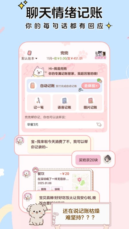 阿兜记账是一款融合AI技术与趣味互动的智能记账工具,以对话式记账、语音输入、地图轨迹等创新功能,是培养理性消费习惯的得力助手。