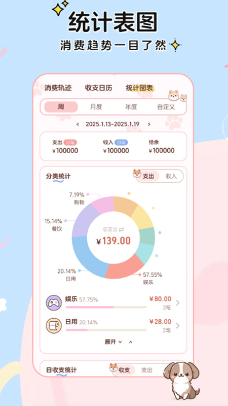 4、可视化数据深度分析:自动生成月度/年度收支统计图,以饼图、柱状图等形式展示消费占比。用户可直观看到餐饮占比35%、购物占比28%等数据,结合AI分析提供消费优化建议,帮助用户科学规划支出。