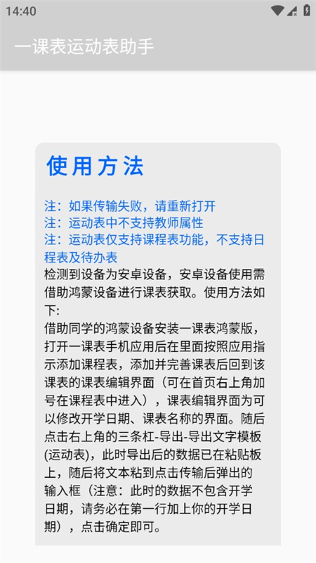 4.检测到设备为安卓设备,安卓设备使用需借助鸿蒙设备进行课表获取。使用方法如下: