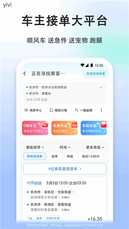 匹配订单,发布路线、时间,匹配更加精准的顺路订单。