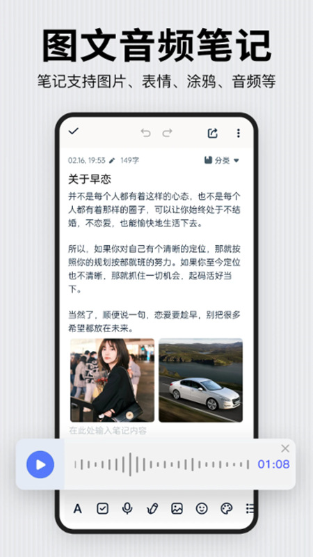 2、突破传统文字输入限制,支持语音转文字、图片OCR识别、手写涂鸦三种创新模式。用户可通过语音快速记录会议要点,拍摄账单照片自动提取文字信息,或用指尖涂鸦记录灵感草图,满足多样化记录需求。