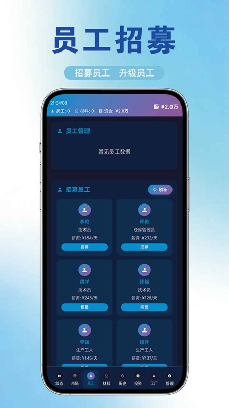 3.丰富员工管理:员工分为工人、工程师、修理工等多工种,不同员工雇佣成本各异,且需根据机器特性匹配适应性强的员工,以优化生产流程。