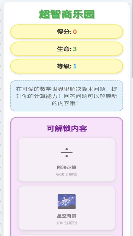 超智商乐园游戏是一款专为儿童设计的休闲益智闯关游戏。它通过从加减法到乘除法等数学运算逐步提升孩子的大脑发育和思考能力,让孩子们在趣味十足的游戏中锻炼智力、开拓思维,是适合小孩子大脑发育阶段玩的优质益智小游戏!