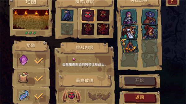 2、开始后再点桌子中央的红色阵法即可进入地图选择界面,这里可以查看已解锁的关卡而选定目标地图后再次点击开始就能正式进入战斗。
