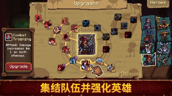 5、通关后会回到休整区域时点击贴着英雄头像的木板就可以对对应角色进行强化升级,每名英雄都有独立的水晶资源但升级时需要合理分配。