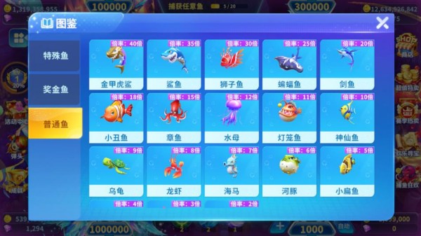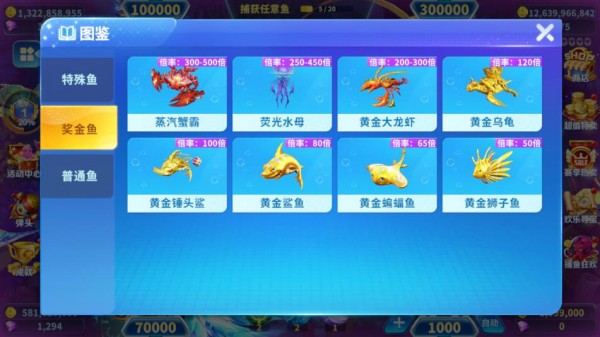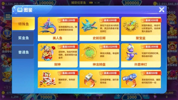6.特殊新鱼种,打鱼掉落新道具可兑换超强弹头,释放华丽特效,金币满屏爆!