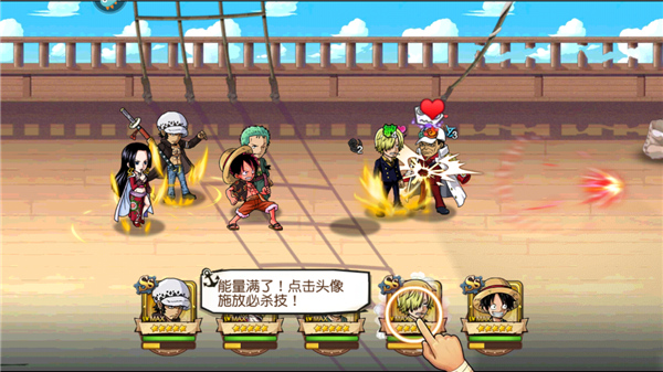 阵容搭配自由:可上阵5名角色+助战角色,组合羁绊效果(如草帽团、七武海、四皇等阵营加成)。