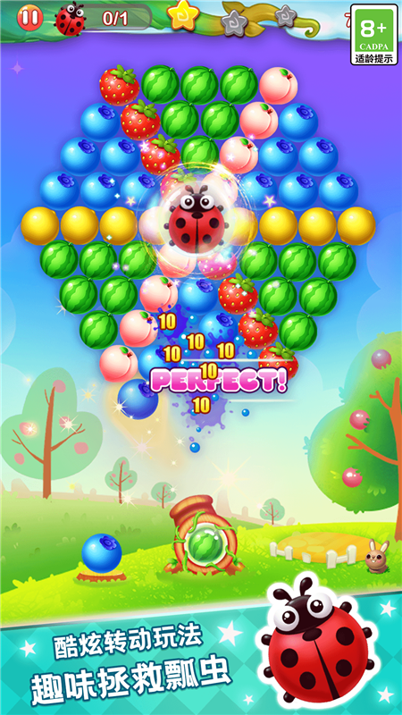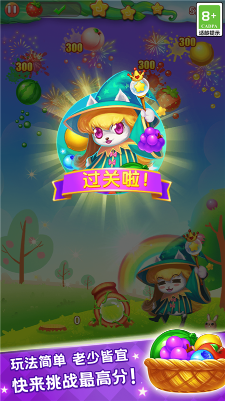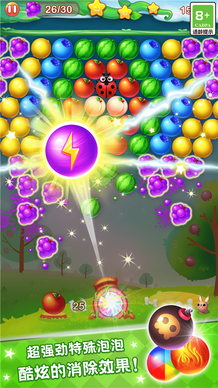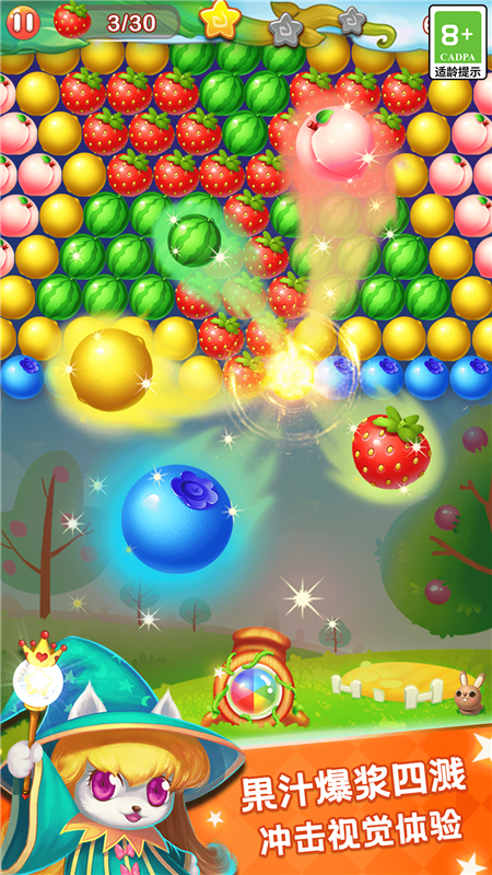 2.在缤纷多彩的水果泡泡群中,和小女巫猫安吉拉并肩作战,一起闯关。