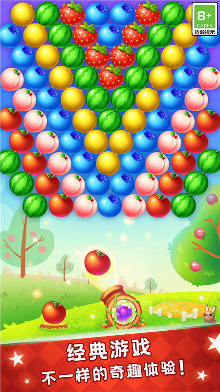 3.《水果泡泡传奇》是一款趣味休闲的消除类手游,玩家通过发射色彩斑斓的水果泡泡,组合相同颜色的泡泡进行消除,挑战多种关卡和任务,体验轻松愉快的游戏乐趣。