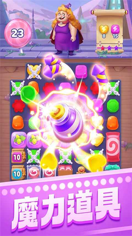 三个女巫一台戏,要么射出几个小怪兽,要么赐予几颗硬糖,要么冰冻某些糖果…总之,她们会想尽一切办法,不让你安宁,唯一的办法就是你必须尽快的消灭她们。