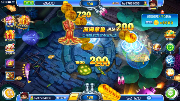 2.190倍蟹王、220倍巨鳄、260倍鮟鱇等各大高倍BOSS任你打,新增逆天BOSS黄金龙击中就有2000万金币等你出击。