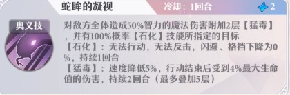 美杜莎的基础速度比晴明还要快20点,搭配她100%石化目标的奥义技,注定了竞技场的地位。先手石化对方的控制英雄,然后我方晴明再冻住对方其他人,小丑看血量进行单点或AOE。