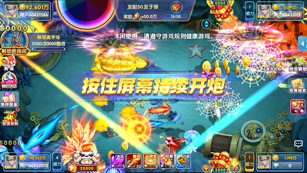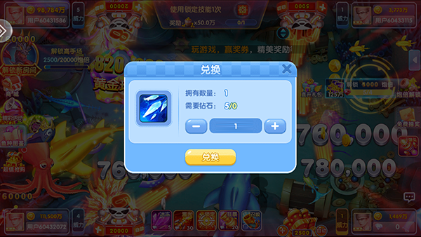 4、道具使用:游戏内提供多种道具,如冰冻、锁定、加速炮弹等,合理利用这些道具可以帮助玩家更有效地捕鱼。例如,在关键时刻使用狂暴技能、加速技能等,可以提高捕鱼效率。