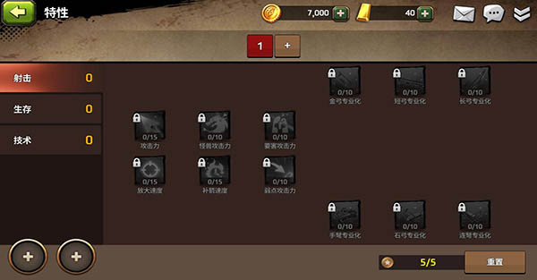 特性分为三大类:射击,生存,技术