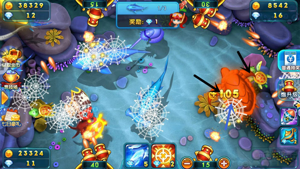游得很慢的鱼,其实就是送分鱼,对于这类在你眼前悠哉悠哉游过去的鱼,赶紧调整好炮台方向发起攻击。这类鱼一般有乌龟、比目鱼、魔鬼鱼等,看到在你面前游过,绝不能放过。