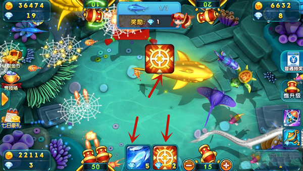 捕鱼不能一味攻打,关键时刻还要恰当使用技能键。像白鲨或者金鲨,捕捉成功获得的奖励都比较大,即便你的炮倍数高,但是不运用一些辅助技能键,未必成功捕到大鱼。使用瞄准技能,配合高炮,就能助你提高命中率。使用冰冻键,能封动全场,这时你移动炮台,找准目标,就比较容易击中。