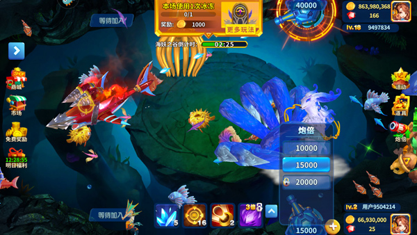 炮台是游戏里最重要的道具,相对来说捕鱼时使用的倍率也是相当重要的,那么在进行游戏的时候,我们要学会根据不同的鱼类、BOSS来选择不同的炮倍。比如在刚进入渔场的时候,BOSS如果还没出现,我们可以切换成低倍炮,捕抓小鱼热热身,节省金币,等待BOSS出现之后,再切换成高倍,实现捕鱼奖励最大化,从而在游戏中获得更多的金币。