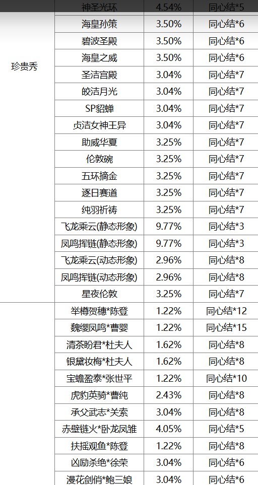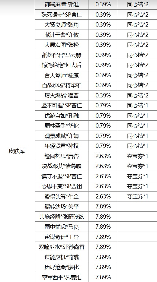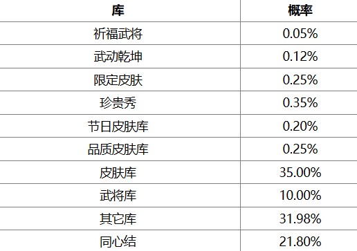 选中珍品限定皮肤为心愿皮肤,则普通奖励79.871%,动态碎片19.828%,皮肤0.301%
