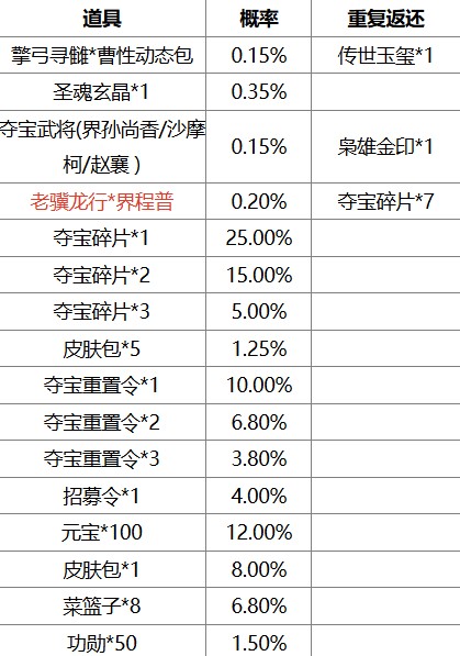 *夺宝武将依次为:界孙尚香/沙摩柯/赵襄,全部拥有后替换为枭雄金印*1;