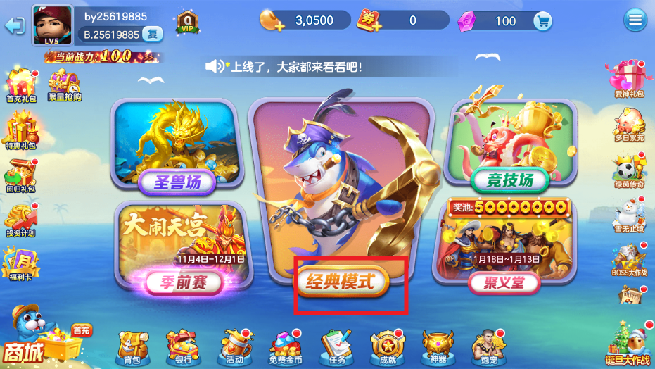 进入开始捕鱼,发射炮弹,捕鱼领取金币