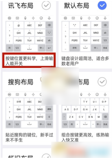 从弹出的布局列表中选择你需要的(如讯飞布局、默认布局、搜狗布局、双键布局、怀旧布局、点划布局等)