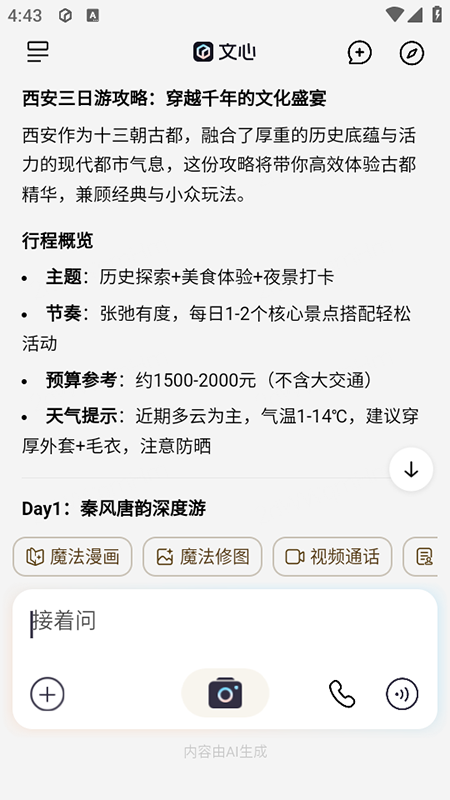 首页点击“搜索框”,输入“西安三日游攻略”,或长按麦克风“语音提问”;
