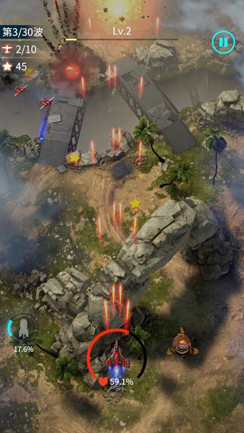 1.强大的升级系统:玩家可以通过完成任务和击败敌人获得经验值,提升战机的性能和武器威力。