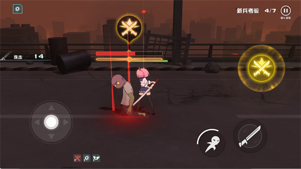 操作方式:虚拟摇杆控制移动,按键组合实现攻击、闪避及连招,配合“斩杀提示”可触发一击必杀Boss的机制。