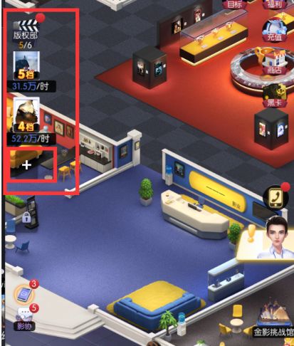 拍完了总得赚钱吧,左边「版权部」,看看有没有空位,如果有空位的话会自动把刚拍完的片放进去销售,如果没有的话,可以选择其中一部收益低的删除,后点+上映刚拍的电影。